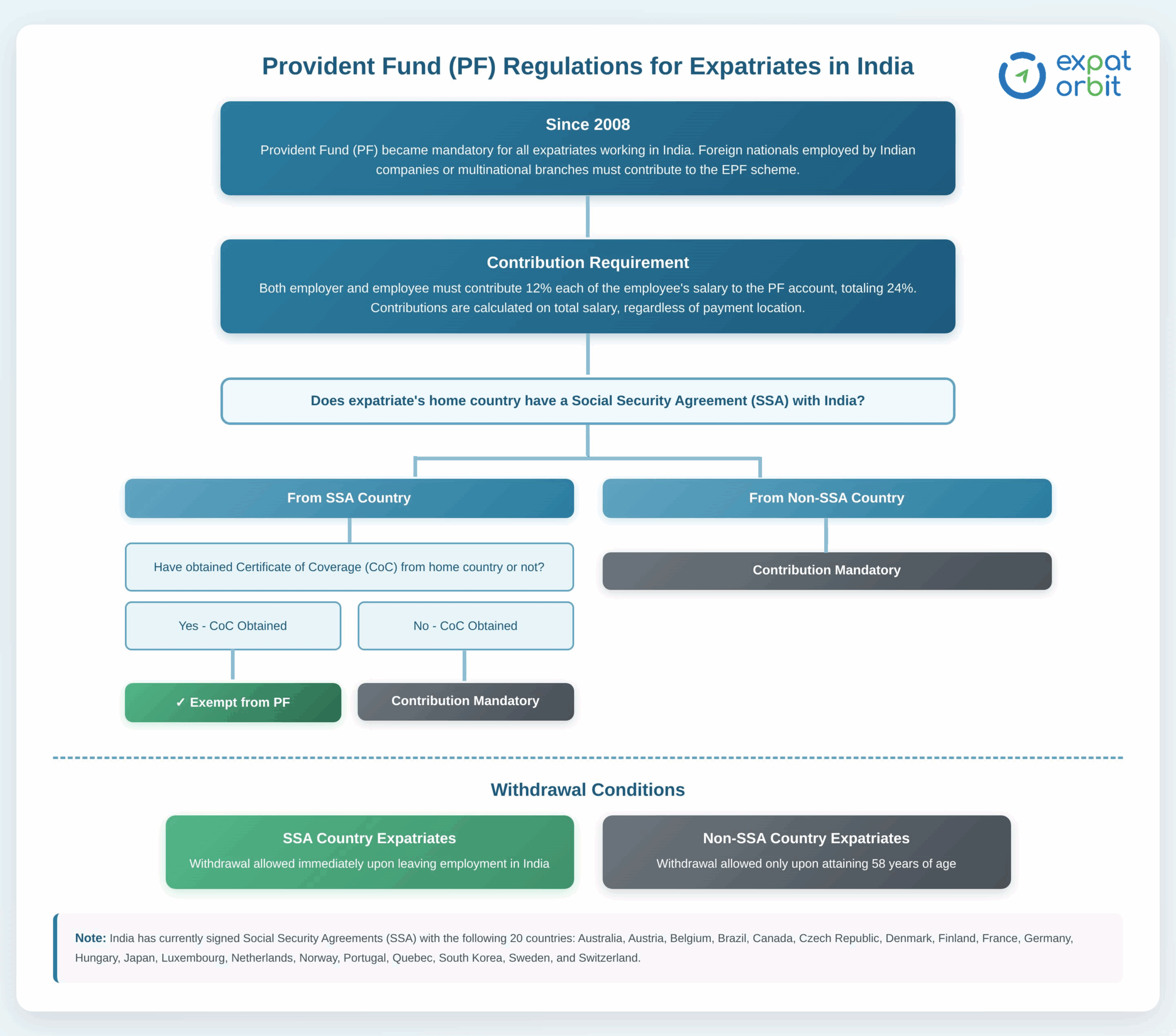 A deep insight into Provident Fund (PF) exemption rules is essential for employers to design cost-effective expatriate assignments while ensuring full compliance with Indian law. Nationals of SSA countries who do not obtain a Certificate of Coverage must contribute to PF but can withdraw their funds immediately after leaving India. In contrast, expatriates from non-SSA countries generally access their PF balances only after reaching 58 years of age, making these contributions effectively inaccessible for long periods.